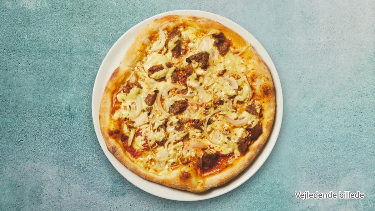 Tomatsauce, ost, kebab, champignon, løg og bearnaise.