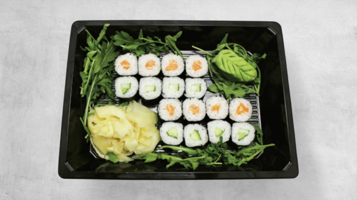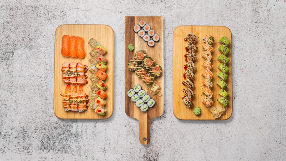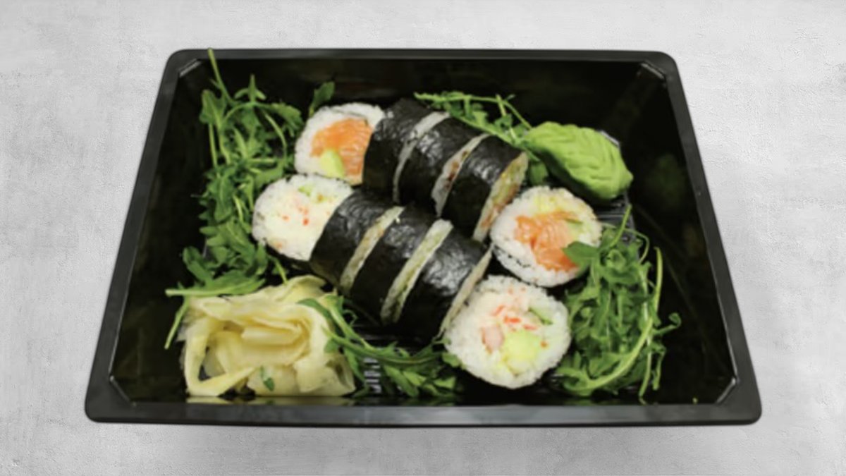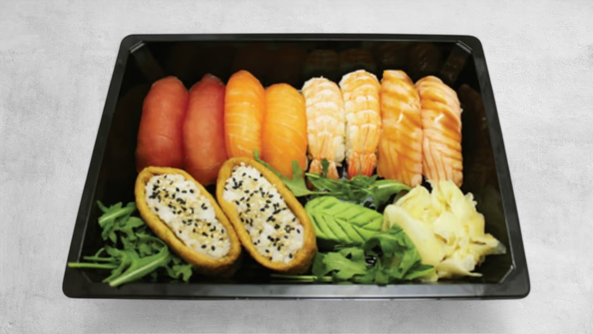 Nigiri: 3 x Laks 3 x Tun 3 x Rejer Hosomaki: 6 x Laks 8 x Agurk Uramaki: 8 x Ebi tempura 8 x California Kaburimaki: 8 x Tempura deluxe 8 x Laks toppet med avocado 8 x Rainbow Futomaki: 6 x California 6 x Laks