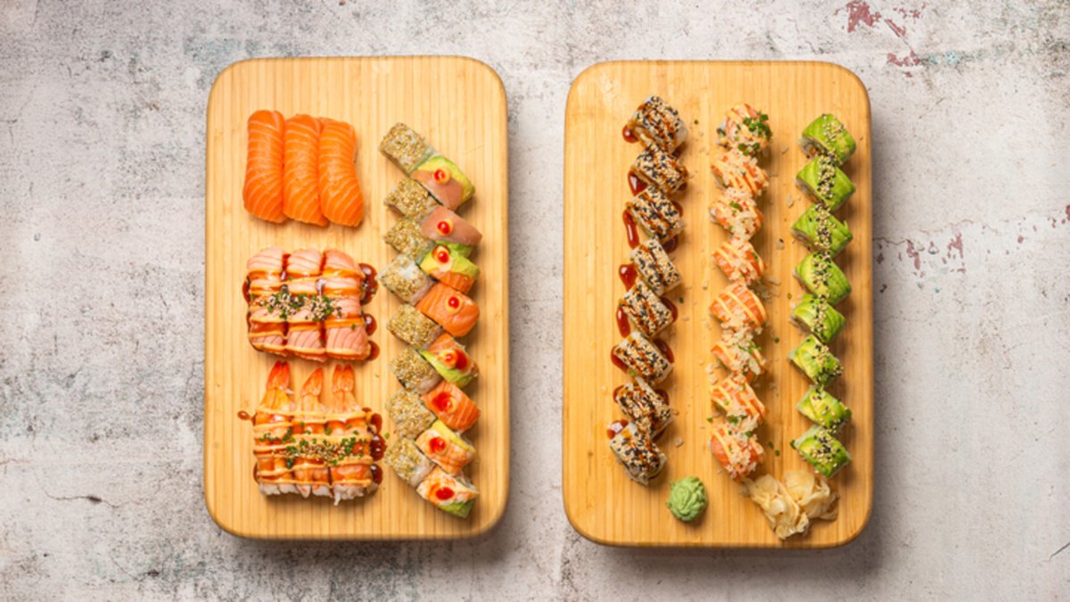 Nigiri: 2 x Laks 2 x Tun 2 x Rejer Uramaki: 8 x Laks Kaburimaki: 8 x Caterpillar roll 8 x Rainbow Futomaki: 6 x California 6 x Laks