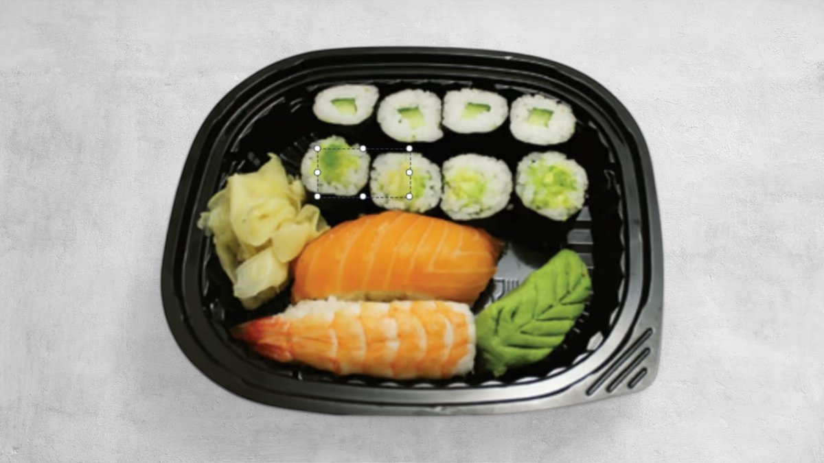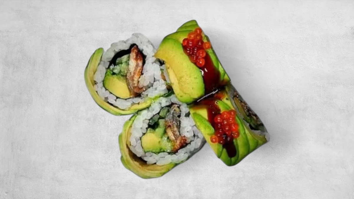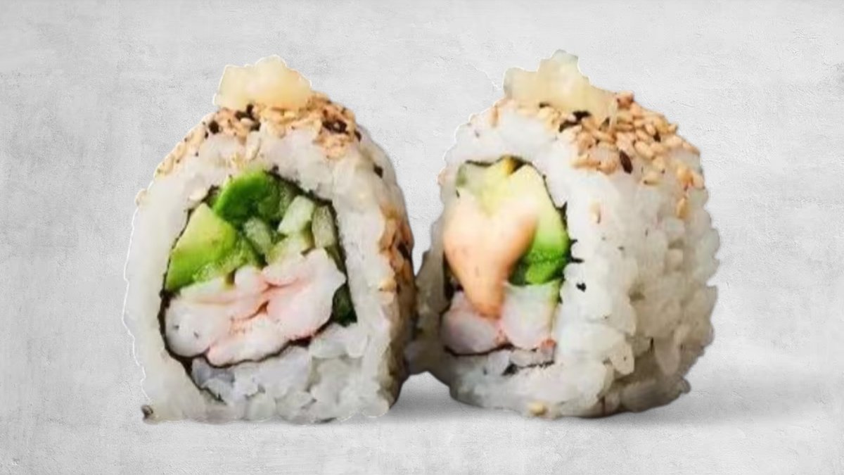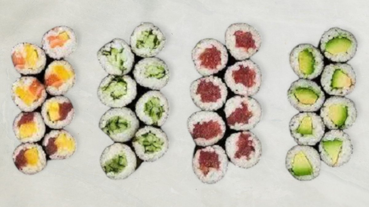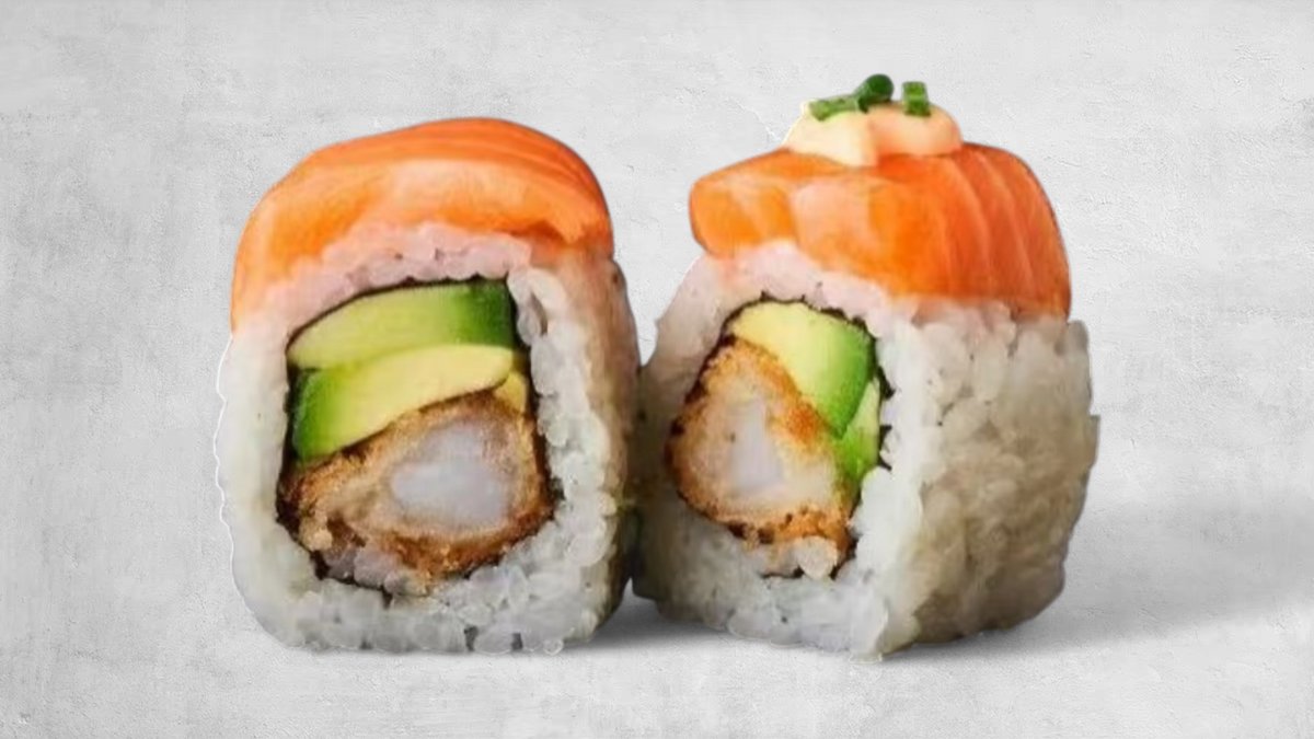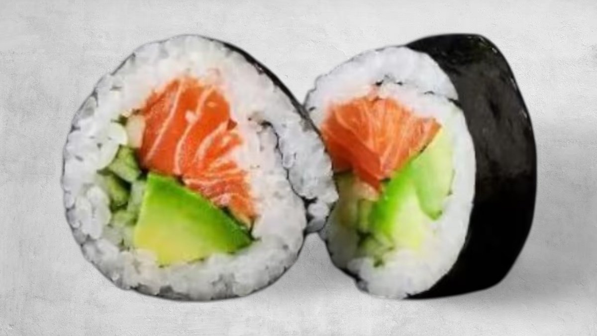 Laks, surimi, mayonnise, avokado og agurk.