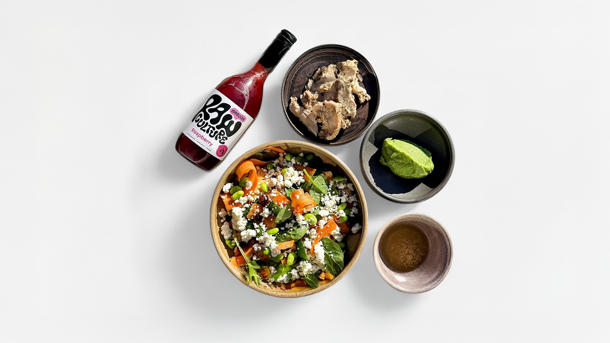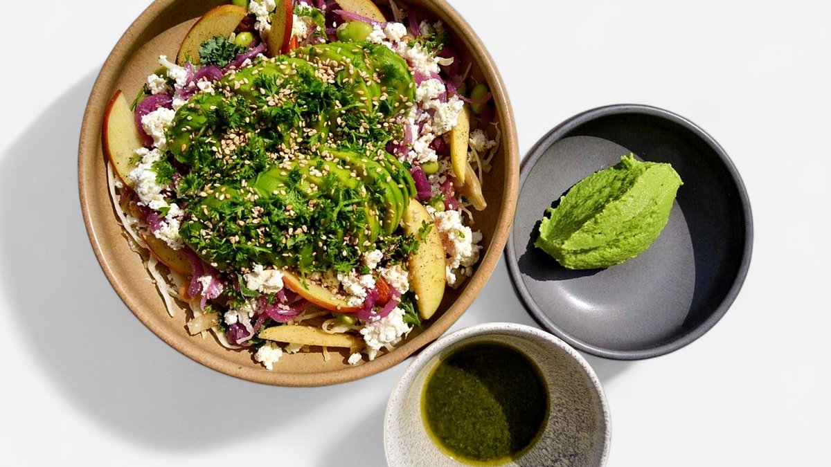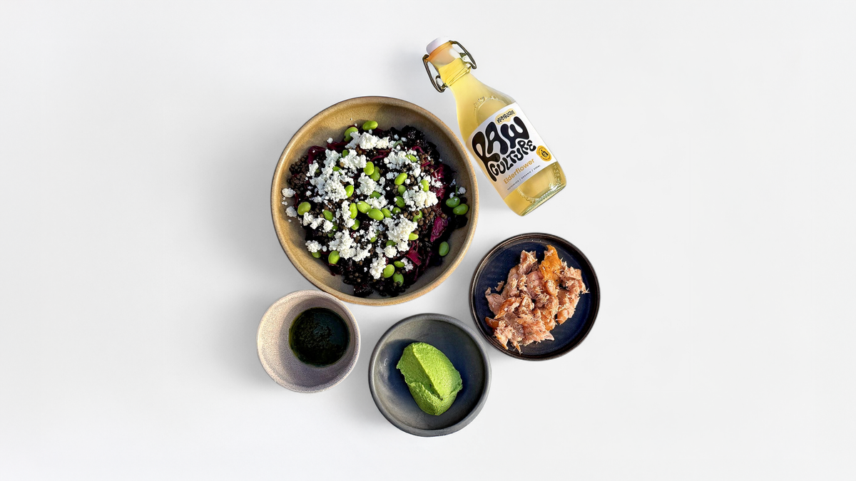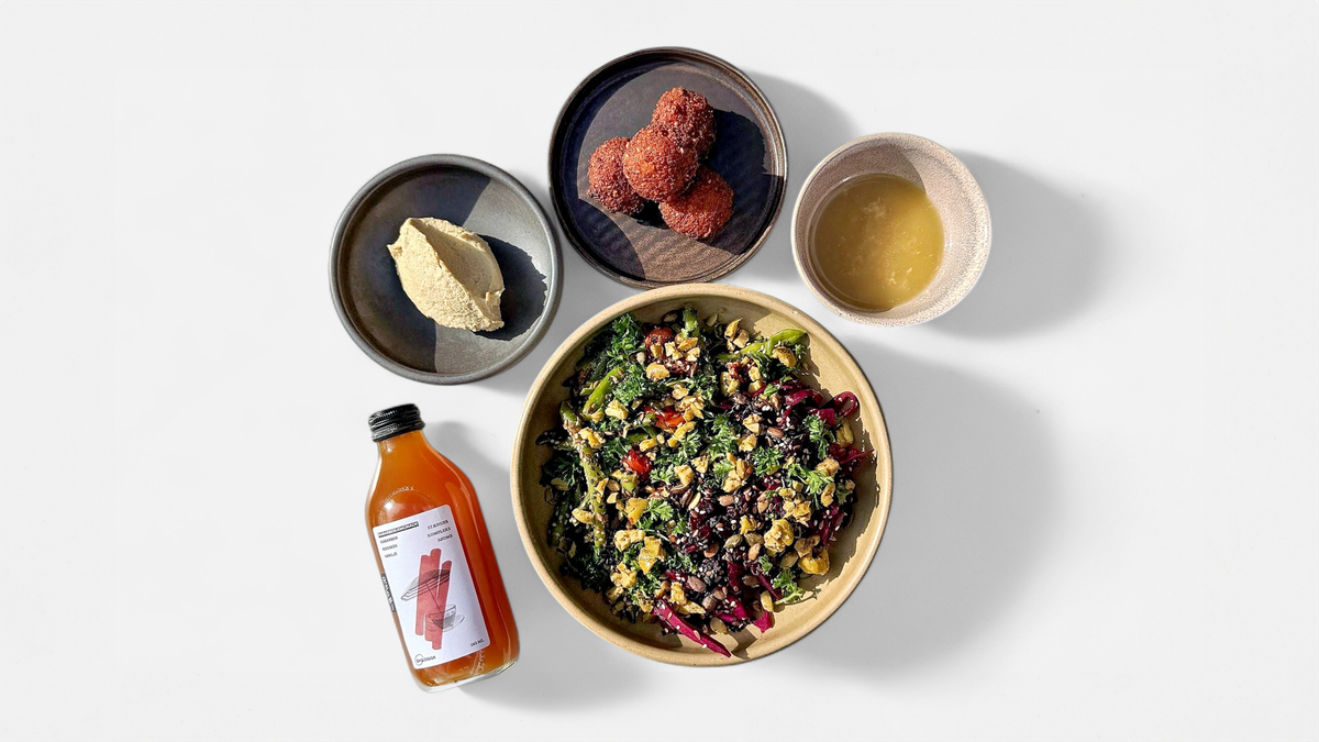 Citronmarineret rødkål, bagte rødbeder, sort sesam, edamame, hvid ost og belugalinser. Valgfri protein, dressing og creme. Serveret med brød og valgfri drikkevare.