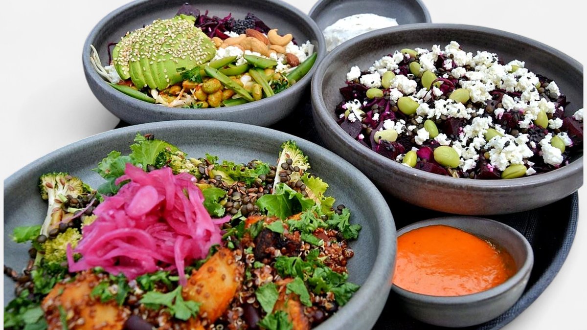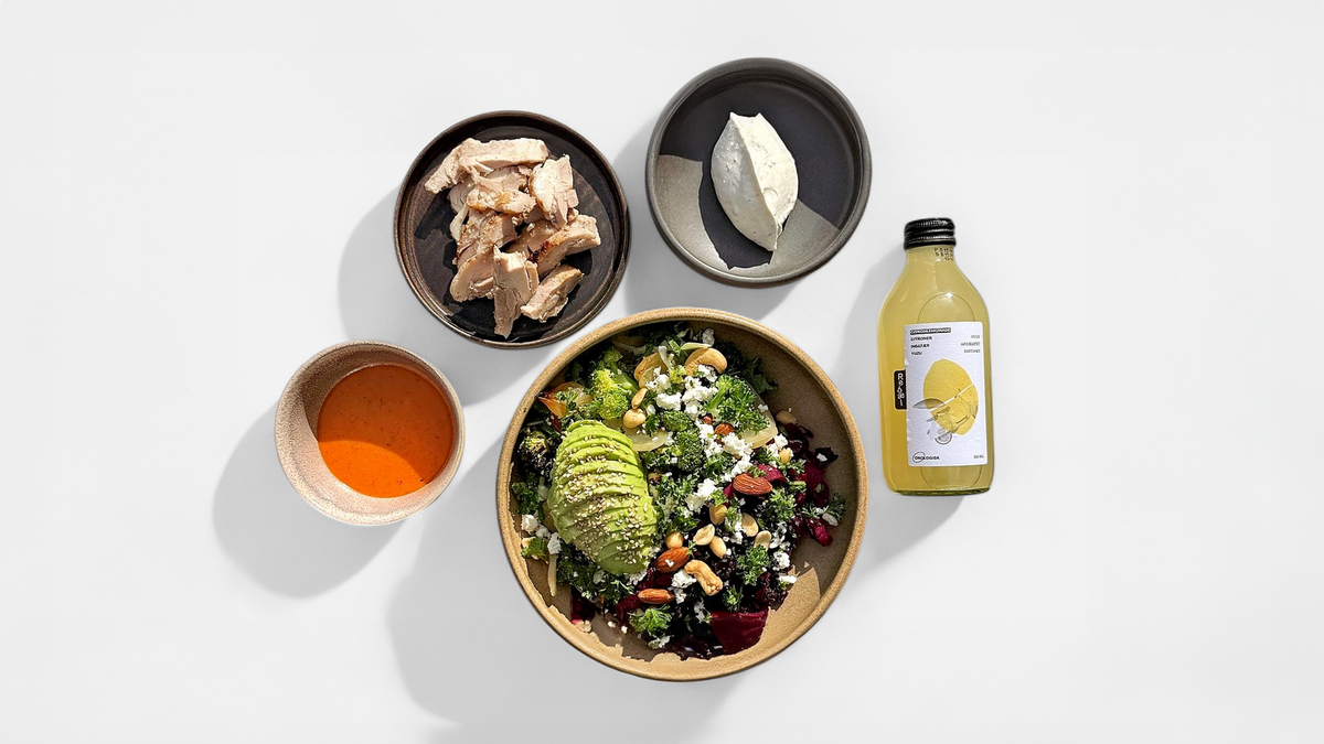 Avocado med sesam, citronmarineret rødkål, bagte rødbeder, sort sesam, kålmix, bagte løg, grillet broccoli saltede nødder, hvid ost saltede nødder, hvid ost. Valgfri protein, dressing og creme. Serveret med en valgfri drikkevare.