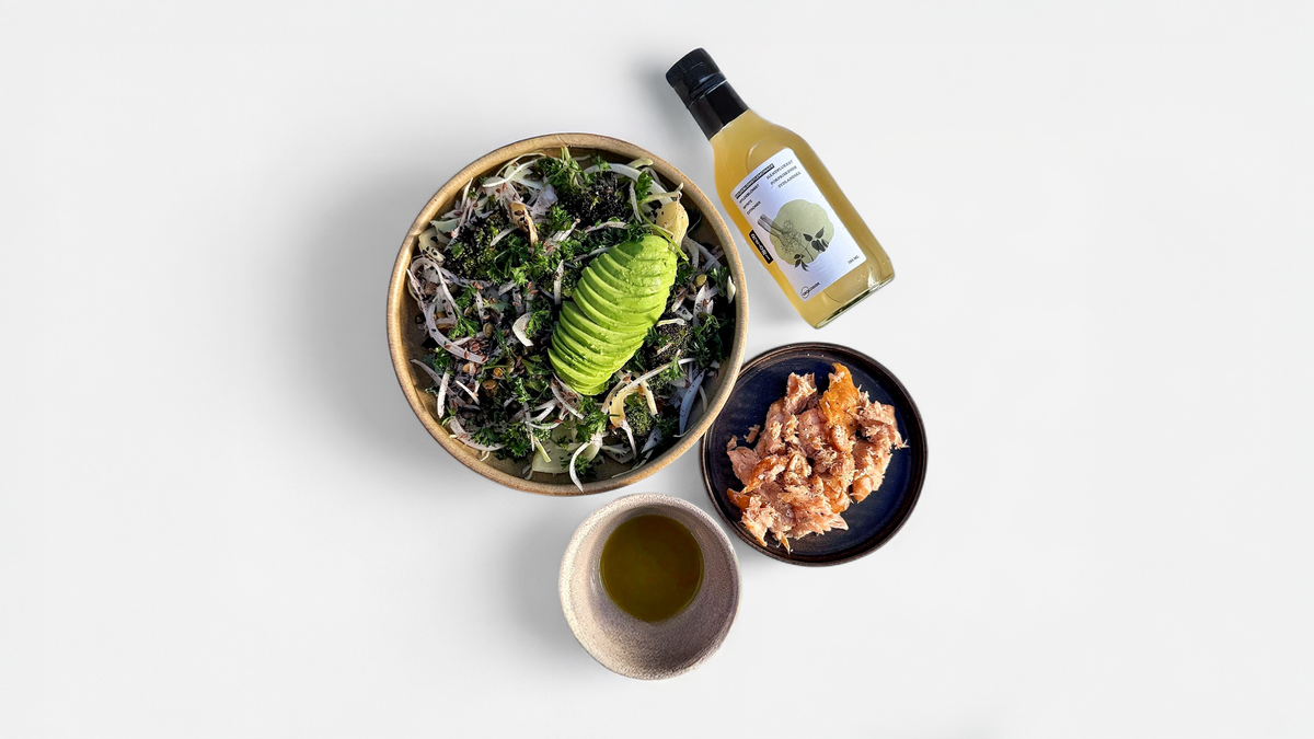 Avocado med sesam, kålmix, med bagte løg, grillet broccoli, sala tløg med sumak, persille, hørfrø, græskarkerner, sort og hvid sesam. Valgfri protein og dressing. Serveret med en valgfri drikkevare.