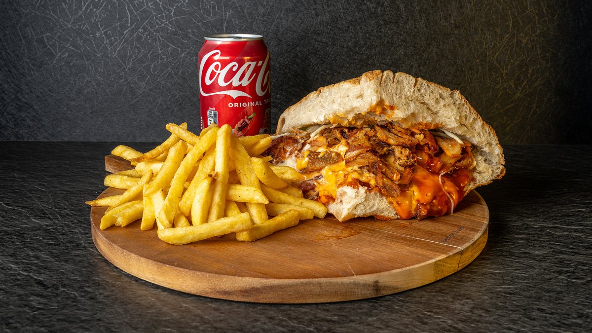Hjemmelavet pitabrød med fyld af valgfri protein, salat, tomat, agurk, løg, rødkål, hvidløgssauce, sriracha sauce og cocktailsauce. Serveres med pommes frites og en valgfri drikkevare.