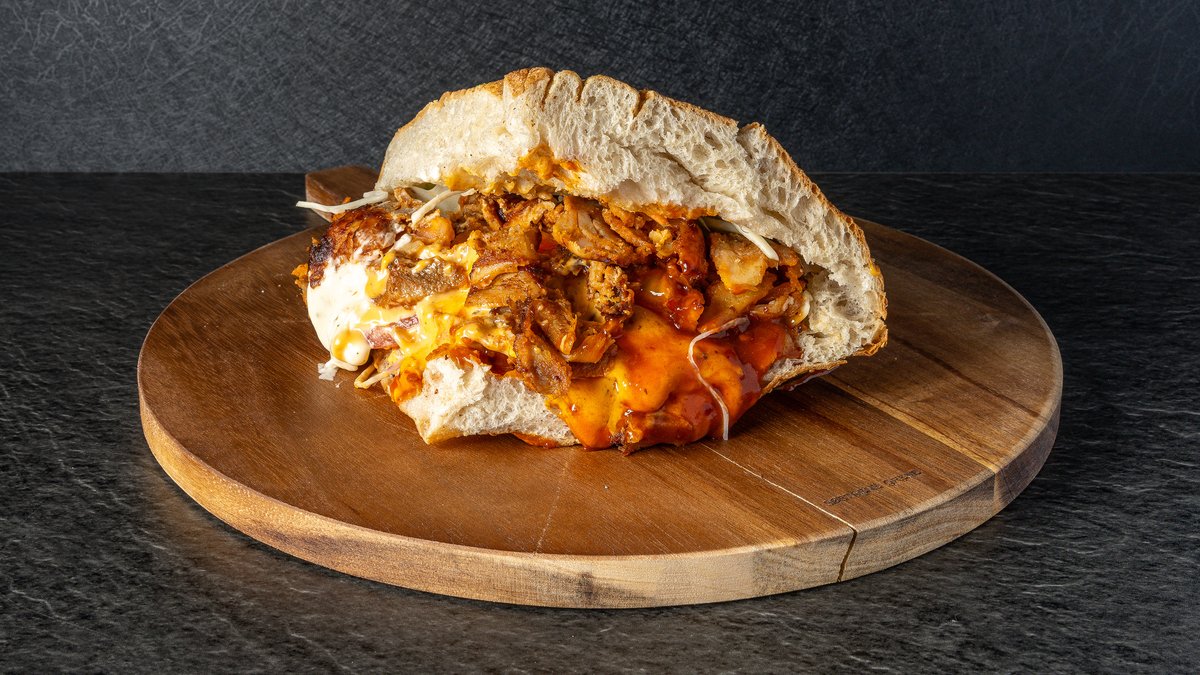 Berliner med fyld af valgfri protein, salat, tomat, agurk, løg, rødkål, hvidløgssauce, sriracha sauce og cocktailsauce.