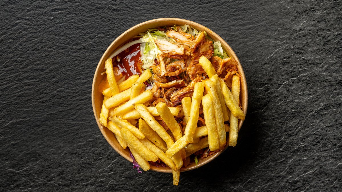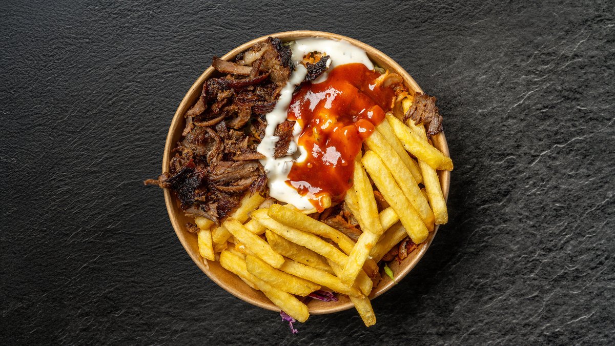Fladbrød med fyld af valgfri protein, salat, tomat, agurk, løg, rødkål, hvidløgssauce, sriracha sauce og cocktailsauce. Serveres med pommes frites og en valgfri drikkevare.