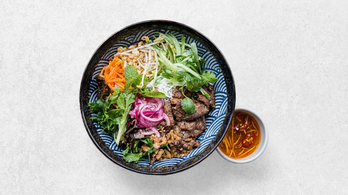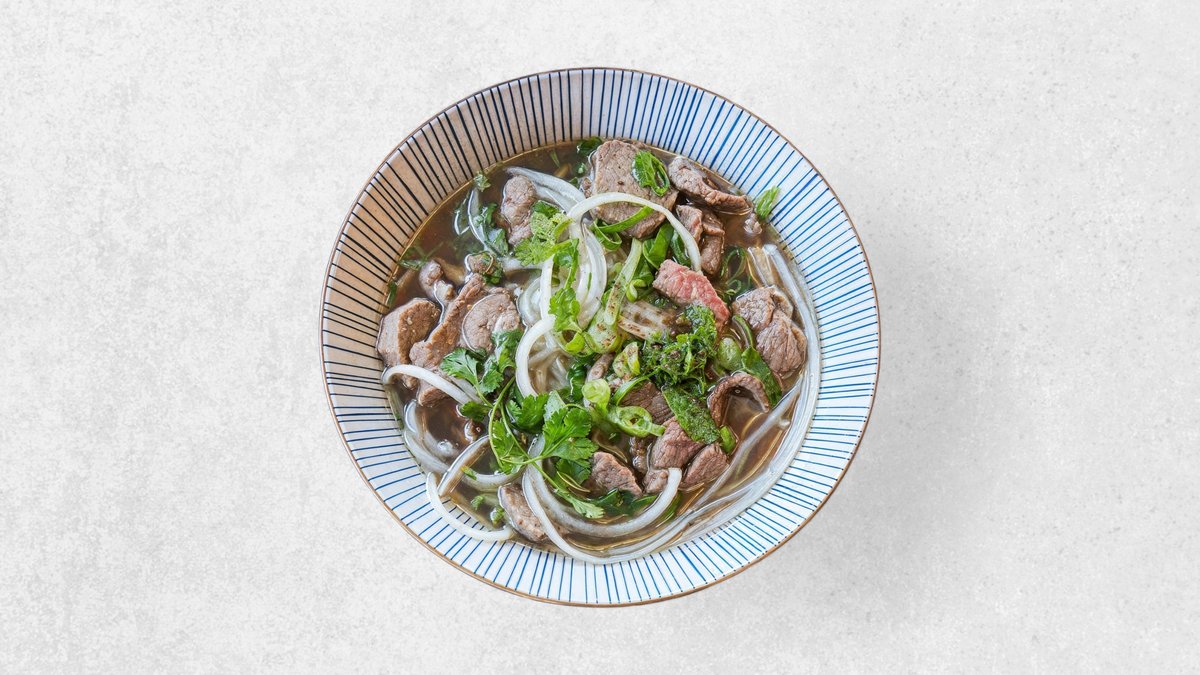 Traditionel vietnamesisk risnudelsuppe med langtidstilberedt oksebryst, hjemmelavede oksekødsboller, grøntsager og koriander.