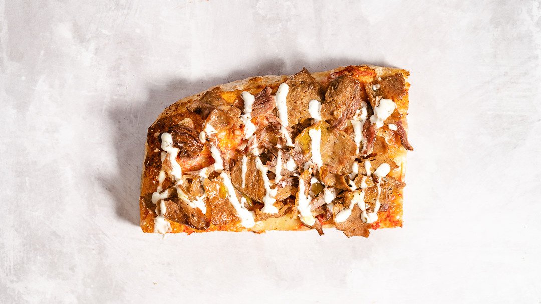 Pizza med ost, tomatsauce, oksekebab og creme fraiche