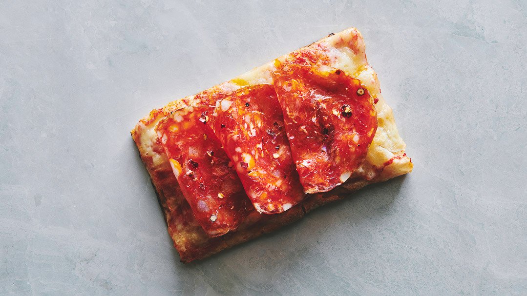 Pizza med ost, tomatsauce og pepperoni. Nok til 2-3 personer.