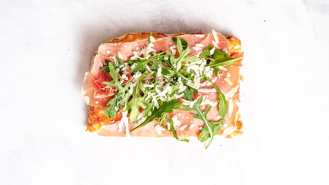 Pizza med ost, tomatsauce, ruccola, parmesan mix og Serrano skinke.