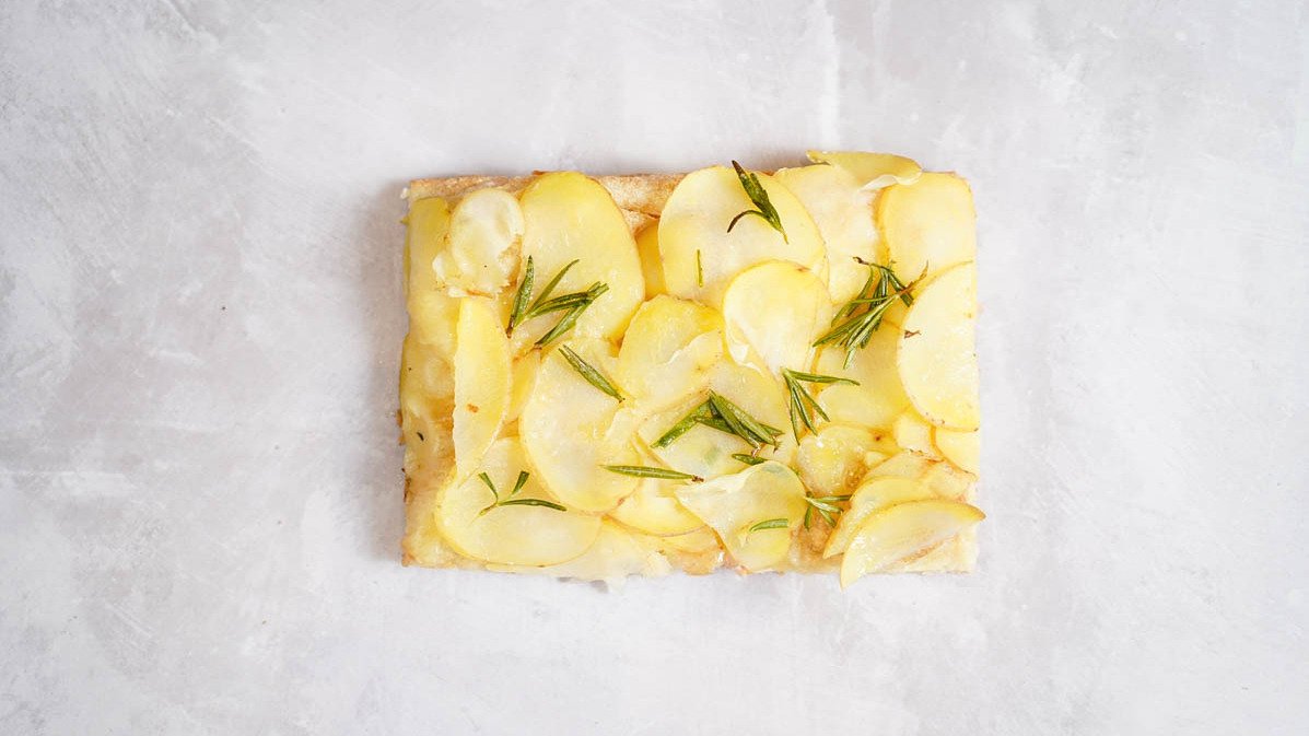 Pizza med ost, fintskårne kartoffelskiver og rosmarin