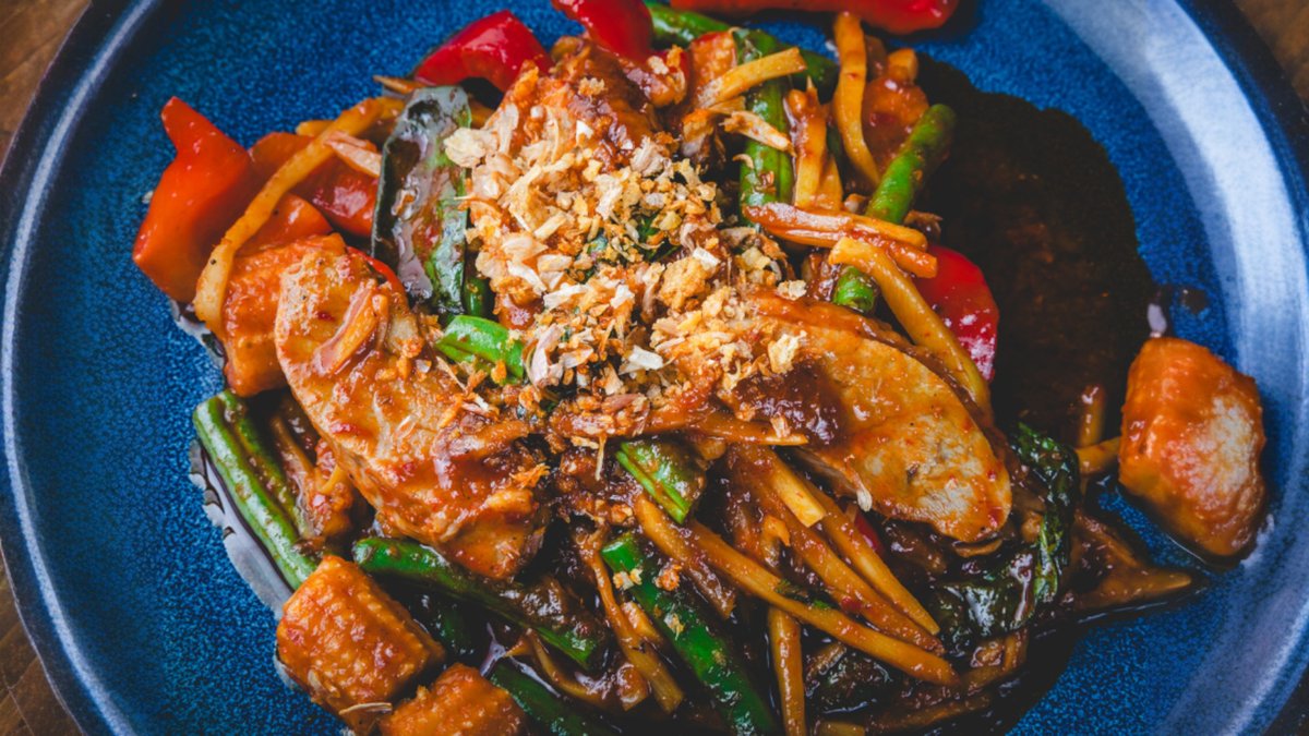Stegt med grønne bønner, bambusskud, løg, peberfrugt, babymajs og hakkede limeblade. Serveres med Jasminris.