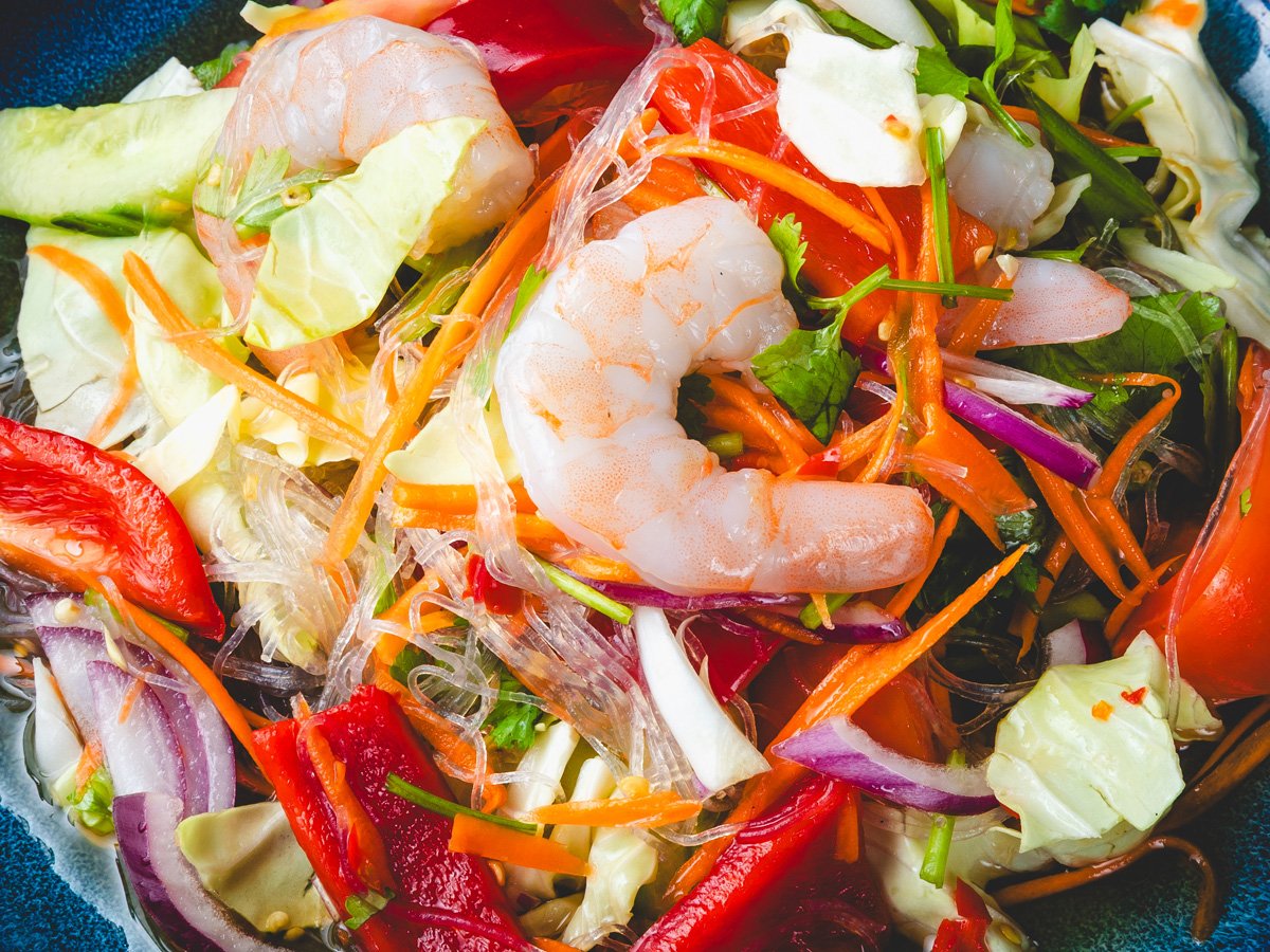 Med tomater, mild thai selleri, rødløg, agurk og spidskål blandet med en stærk chilimarinade.