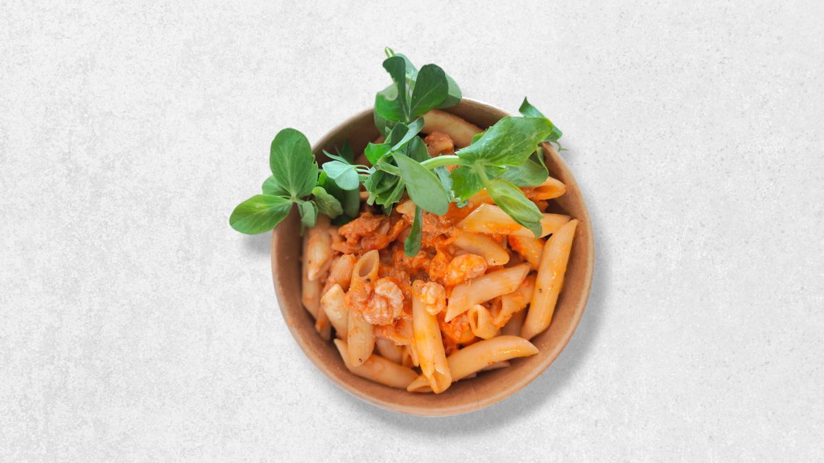 Pasta vendt i tomatflødesauce med laks og rejer.