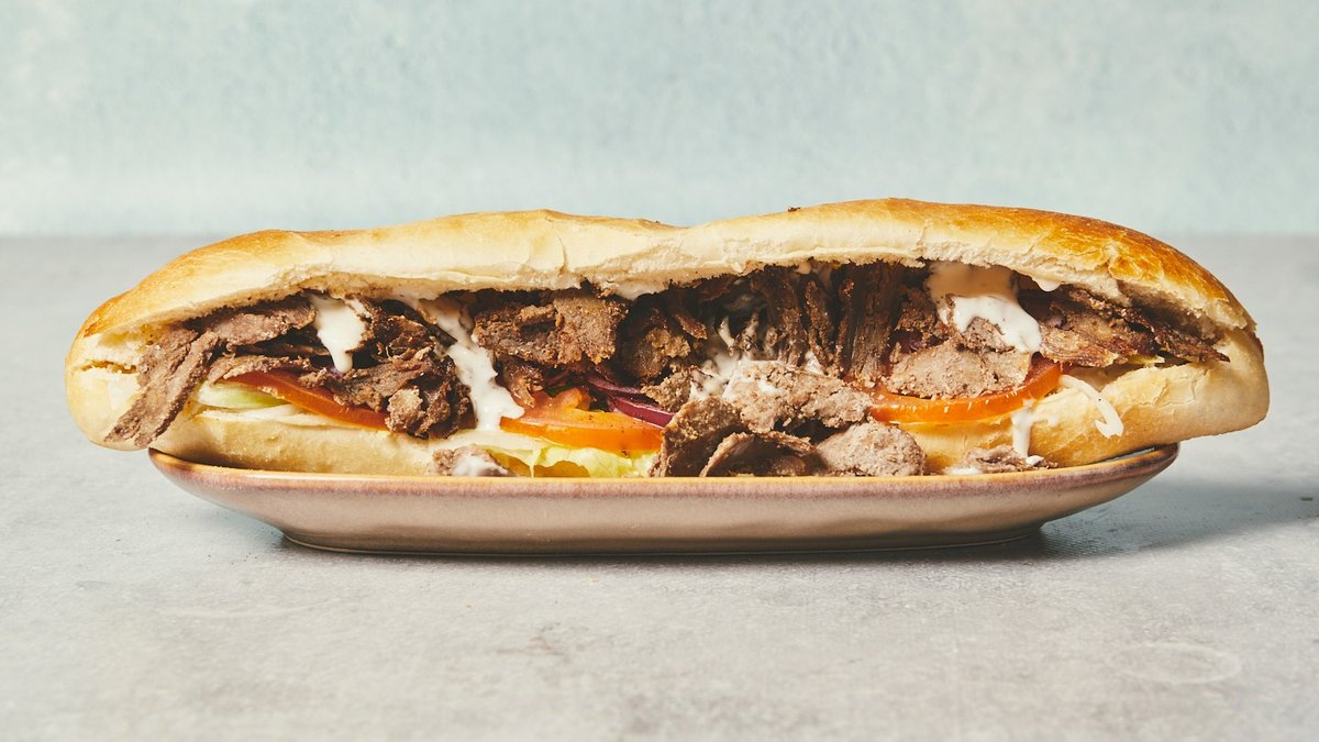 Baguette med valgfrit protein, salat, tomat, rødløg og dressing. Serveres med pommes frites og en valgfri sodavand.