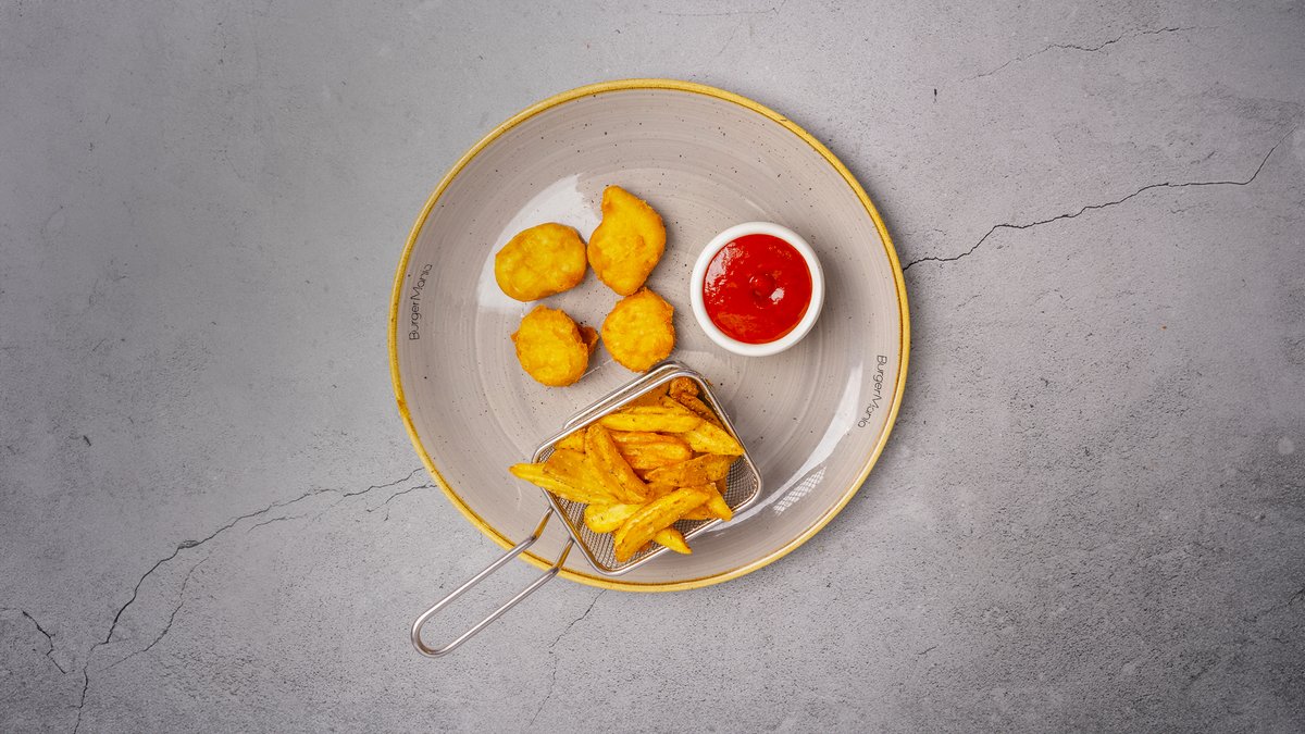 Crispy kyllingenuggets med ketchup. Serveres med valgfrie pommes frites.