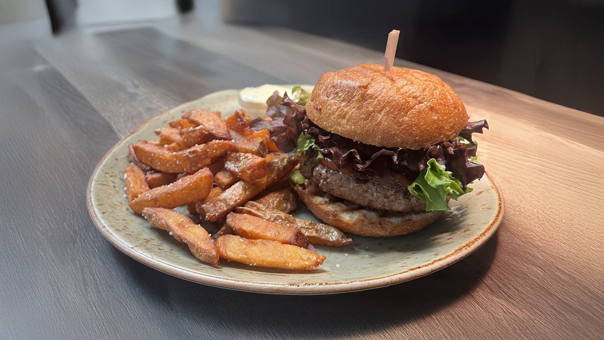 Hjemmebagt burgerbolle med fyld af valgfri protein, agurk, tomat, løg, burgerdressing og ketchup. Hertil håndskårne Øko fritter.