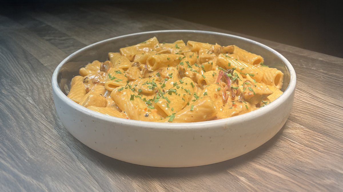 Pasta vendt i karry-tomatsovs med valgfri protein, hviløg og løg.
