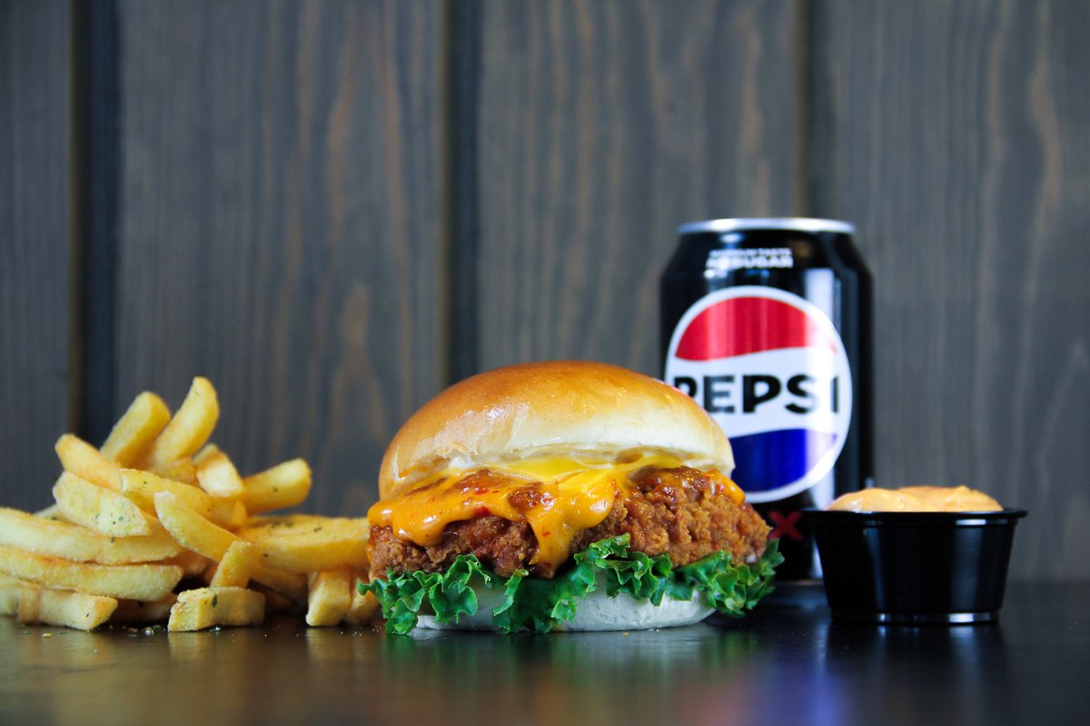 Paneret kylling, cheddar, salat, mayo & vores egen maple sriracha sauce. Inklusiv Shake Fries, Dip & Drikkelse.