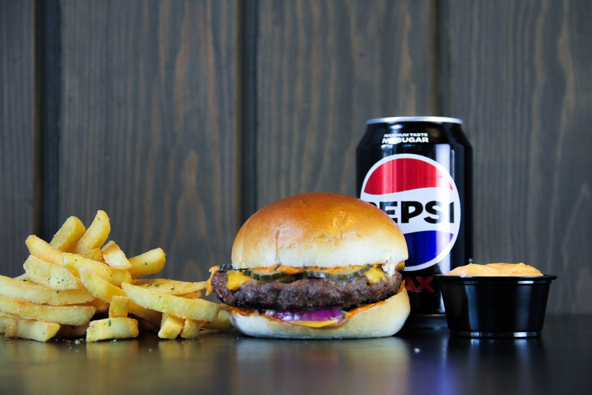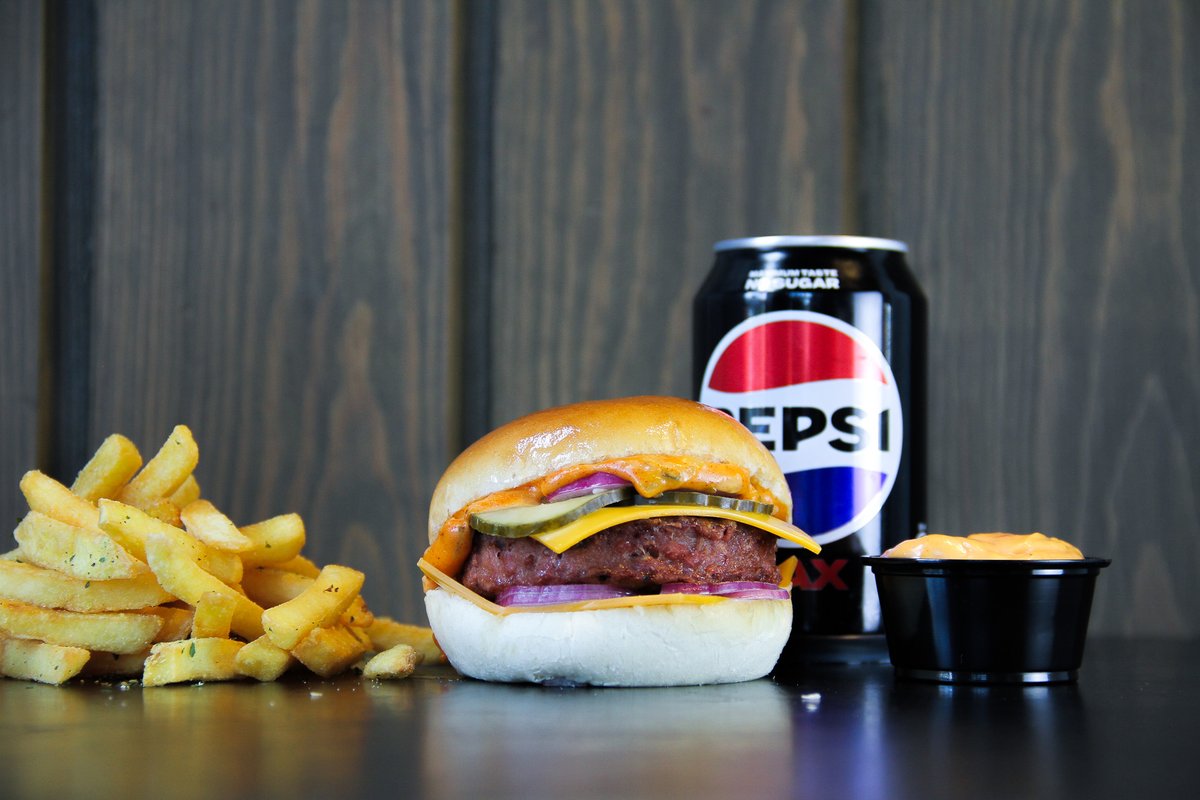 NoBeef Burger, cheddar, friske rødløg, pickles & CPH BURGER sauce. Inklusiv Shake Fries, Dip & Drikkelse.