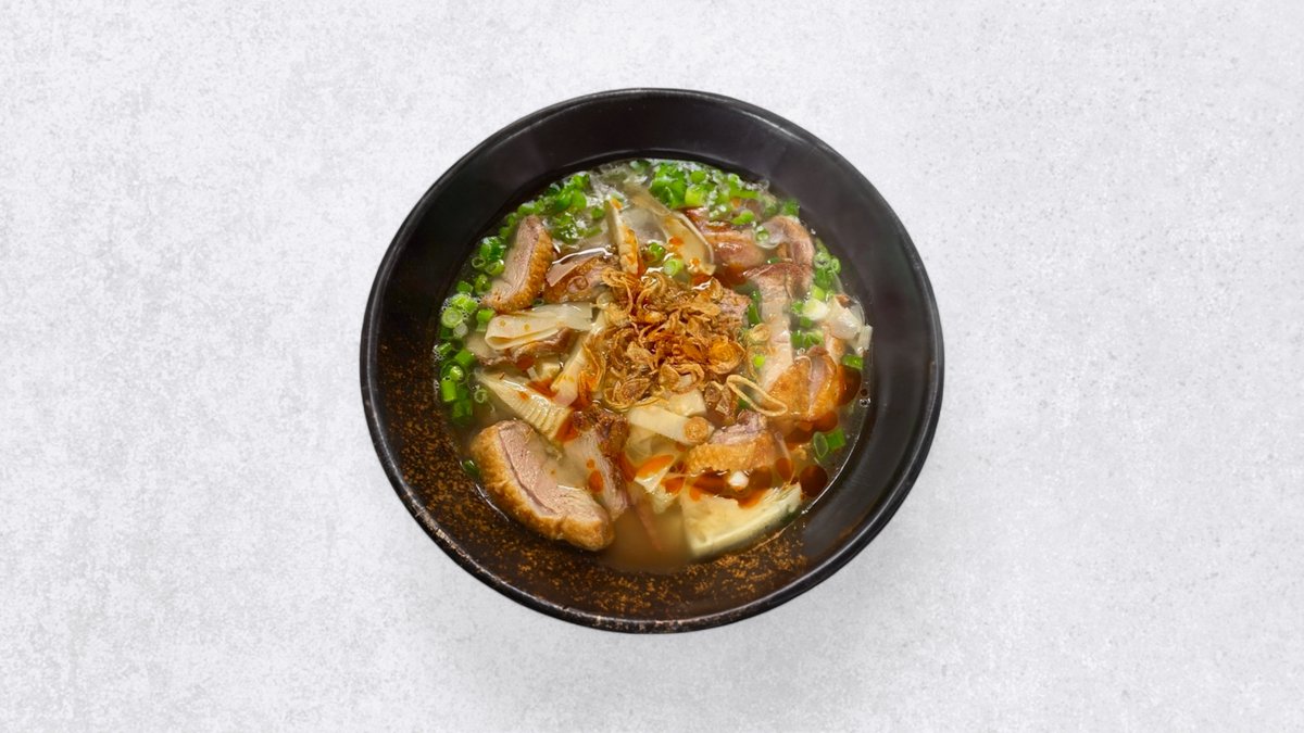 Risnudler i suppe med and og bambusskud serveret med chili, grønt og urter.