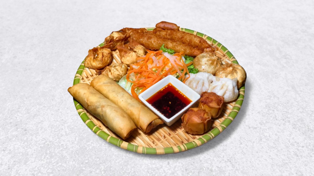 2 x forårsruller, 2 x tempurarejer, 2 x dumplings, 2 x siu mai og 2 x ha cao serveret med salat.