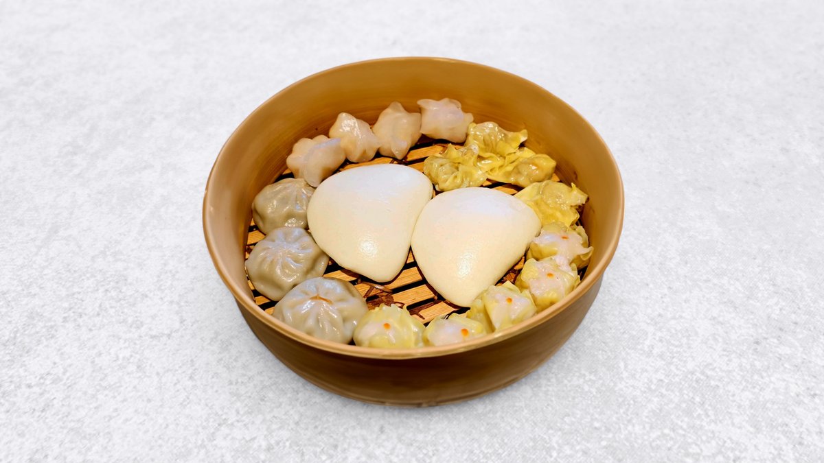 2 x bahn bao, 4 x dumplings, 2 x siu mai og 2 x ha cao.