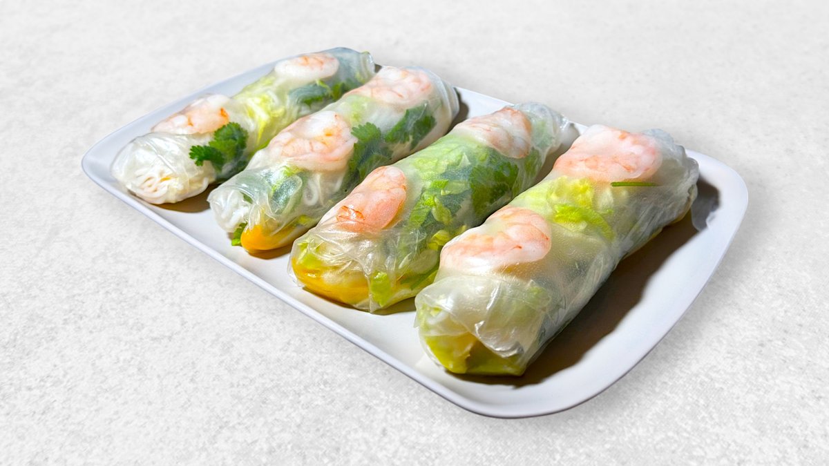 Med fyld af rejer, svinekød, glasnudler, æg og gulerødder serveret m. fiskesauce.