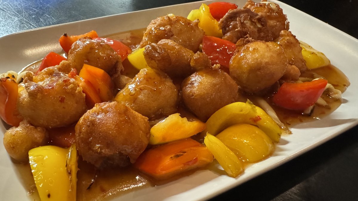 Indbagt kylling stegt i sursødsauce og grøntsager serveret med ris.