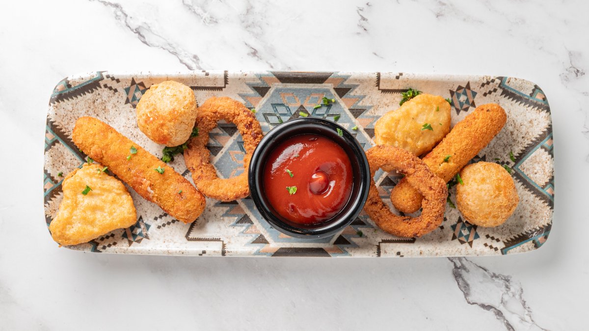 2x Chili cheese tops 2x Mozzarellasticks 2x Løgringe 2x Nuggets Serveres med dyppelse.