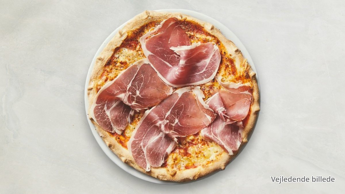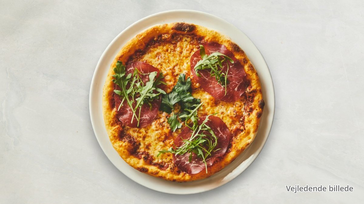 Tomatsauce, ost, parmaskinke, cherrytomater, rucola, mozzarella og ristede pinjekerner.