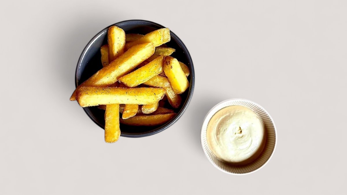 saltet okseinderlår, serveret med wasabimayo, nori chips, daikon, sesam, oyster sauce, pommes frites og aioli