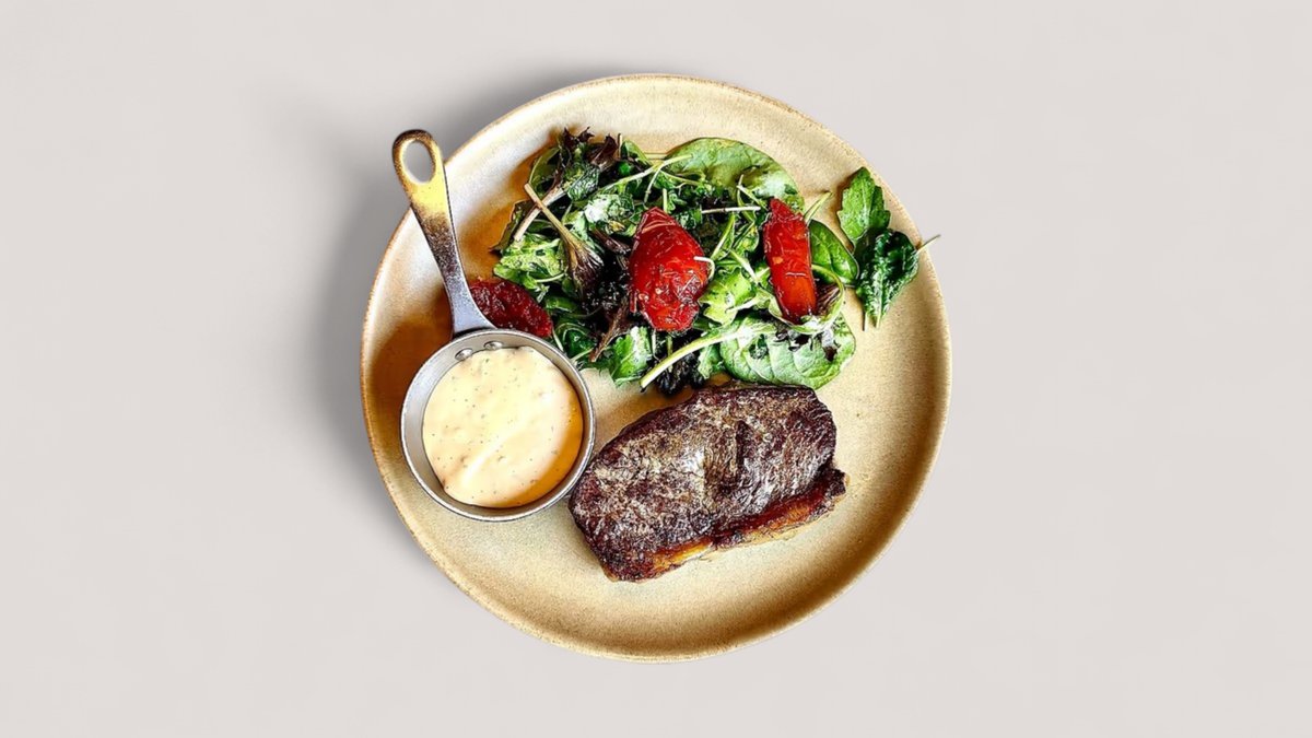 af oksestriploin kommer med sprøde fritter, frisk salat og bearnaisemayo