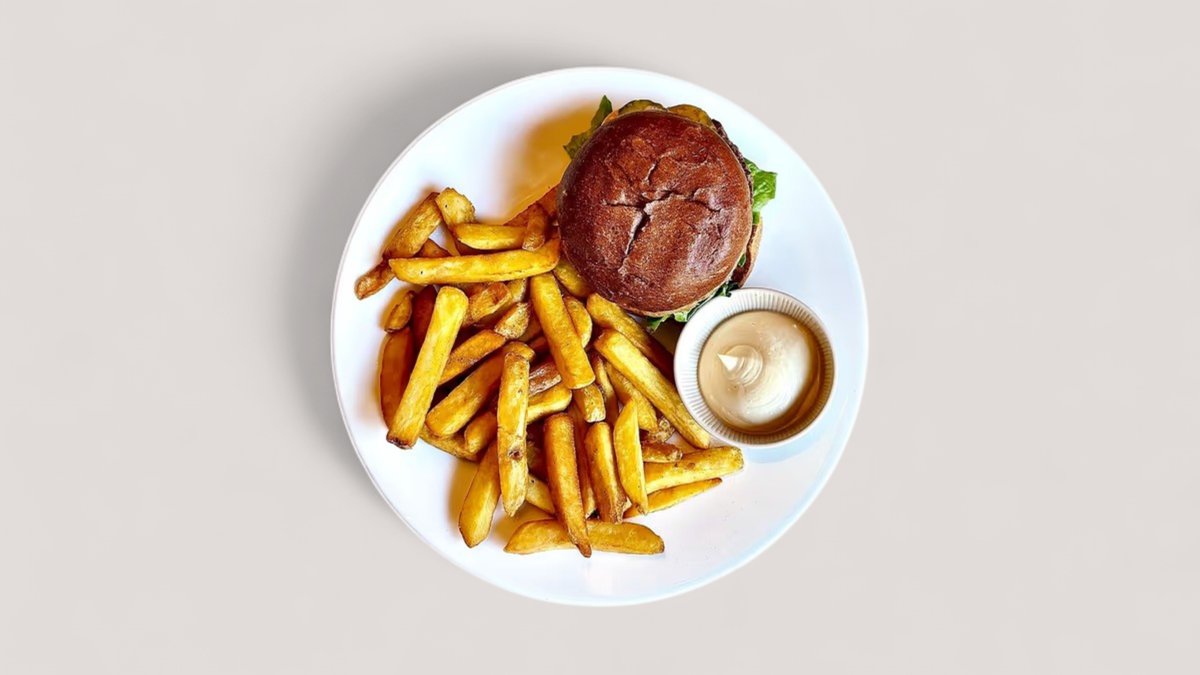 med oksebøf, cheddar, rødløg, drueagurk, sprød salat og hjemmelavet burgerdressing, hertil kommer der sprøde fritter med hjemmelavet aioli