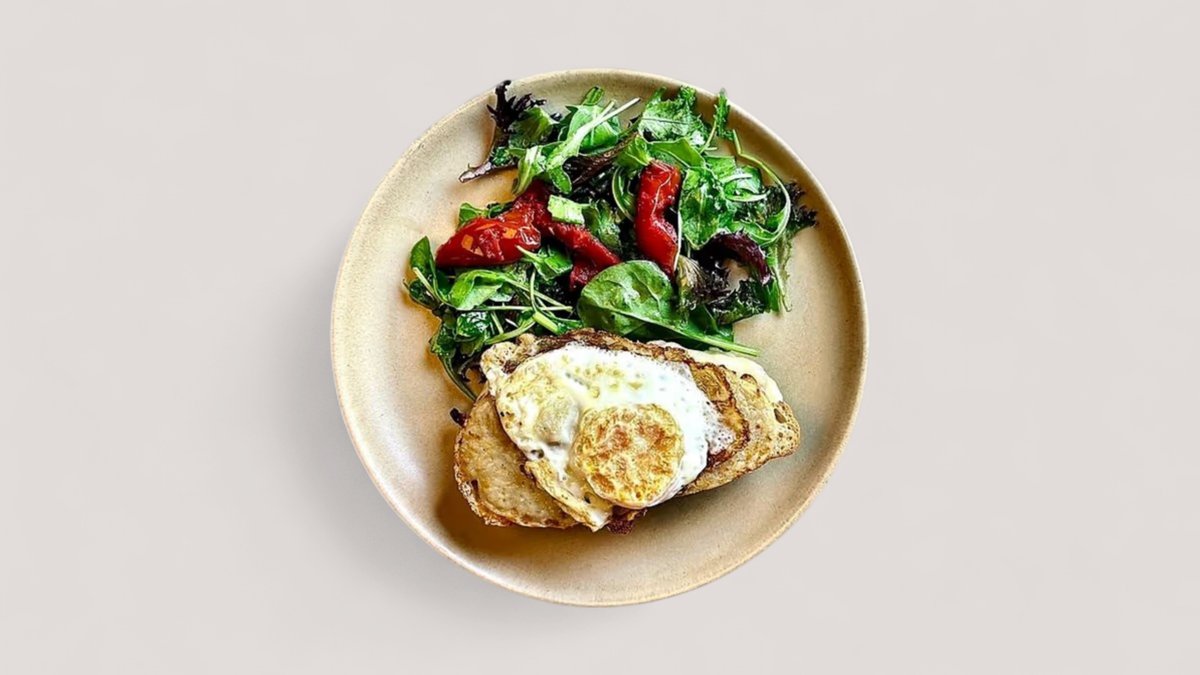 med trøffelbechamel, surdejsbrød, landskinke, gruyere, grov sennep med spejlæg på toppen og en frisk salat ved siden af