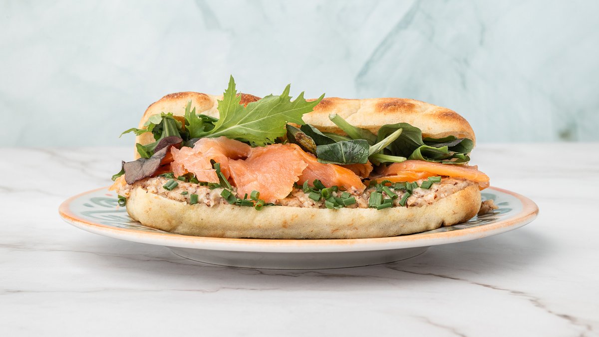 Brød med fyld af røget laks, purløg, nøddedressing og mix salat.
