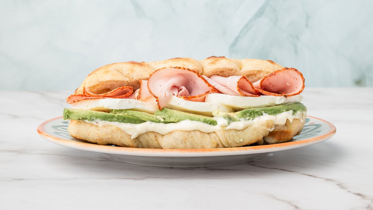 Brød med fyld af rosmarinskinke, avocado, mozzarella og dijonmayo.