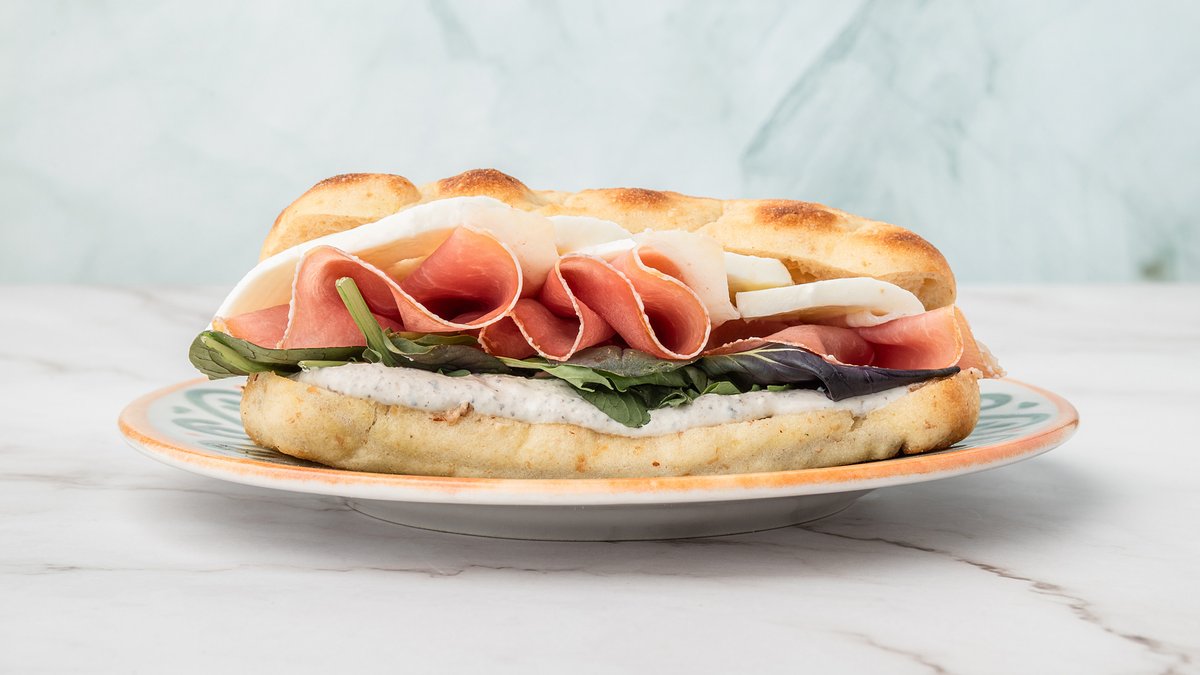 Brød med fyld af trøffelcreme, parmaskinke, mozzarella og mix salat.