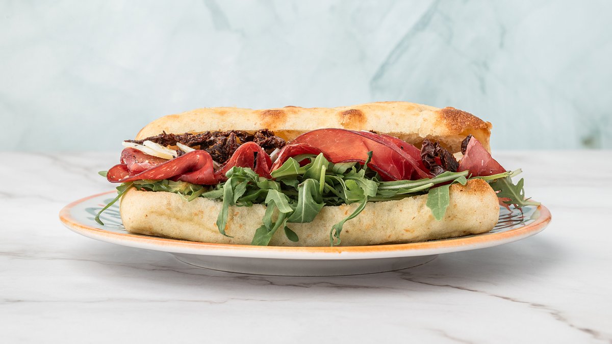 Brød med fyld af bresaola, grana padano, soltørrede tomater, peber, citronolie og rucola.