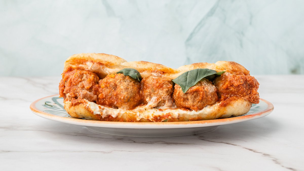 Brød med fyld af hjemmelavede kødboller, provolone, tomatsauce og basilikum.