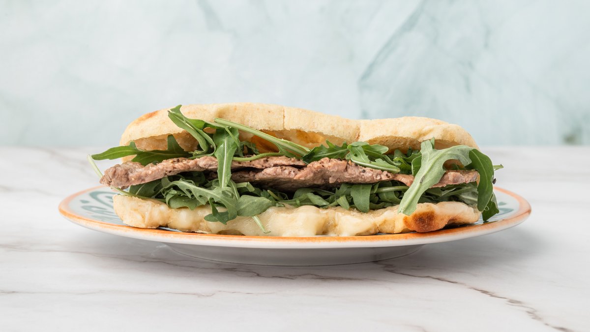 Brød med fyld af kalvekød, grana padano, peber, rucola, olivenolie og balsamico.