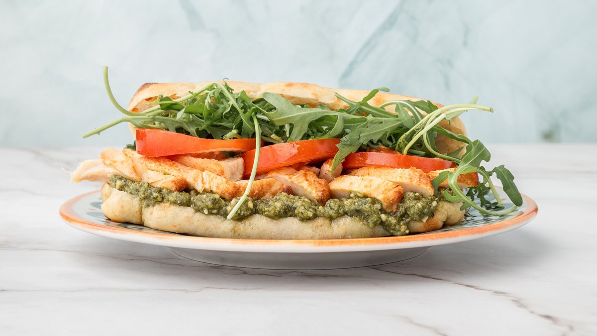 Brød med fyld af kylling, tomat, pesto, rucola og basilikum.