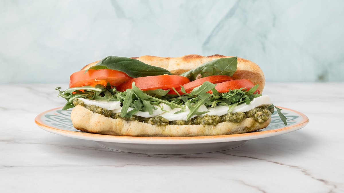 Brød med fyld af mozzarella, tomat, pesto, mix salat og basilikum.
