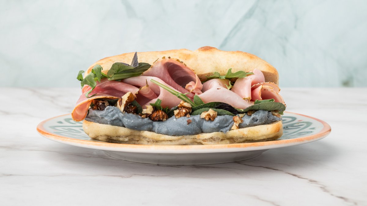Brød med fyld af rosmarinskinke, gedeostcreme, honning, valnødder og mix salat.