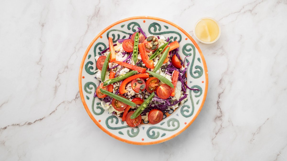 To slags kål, sukkerærter, cherrytomater, peberfrugt, fetaost og græskarkerner.