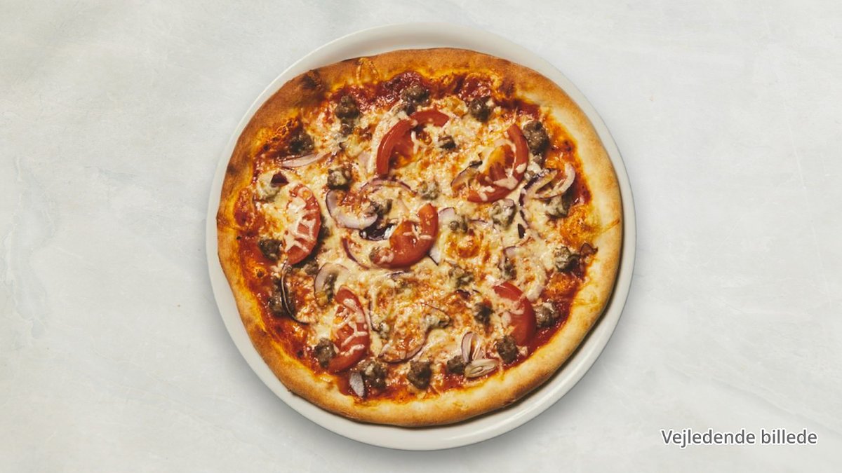 Tomatsauce, pizzaost, oksekød, gorgonzola, løg og oregano