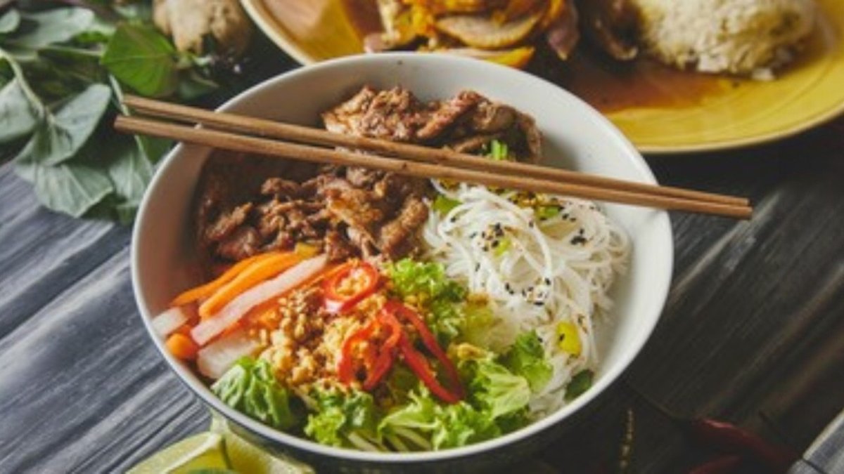 Risnudler med vietnamesisk urtesalat og tilbehør. Serveres med vores hjemmelavet fiskesauce samt valgfrit tilbehør hvor der kan vælges forårsruller med svinekød, BBQ-pork, oksekød eller kylling.