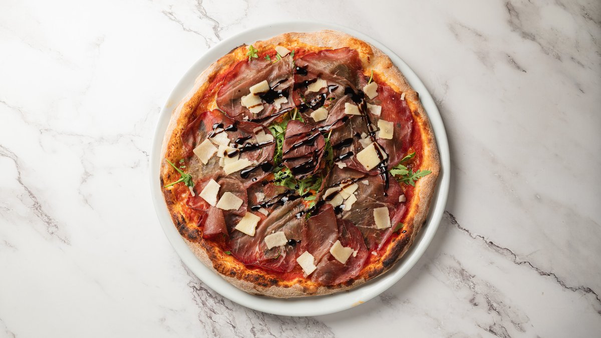 Tomatsovs, mozzarella fior di latte, rucola, lufttørret okseinderlår, parmesan og balsamico glace.