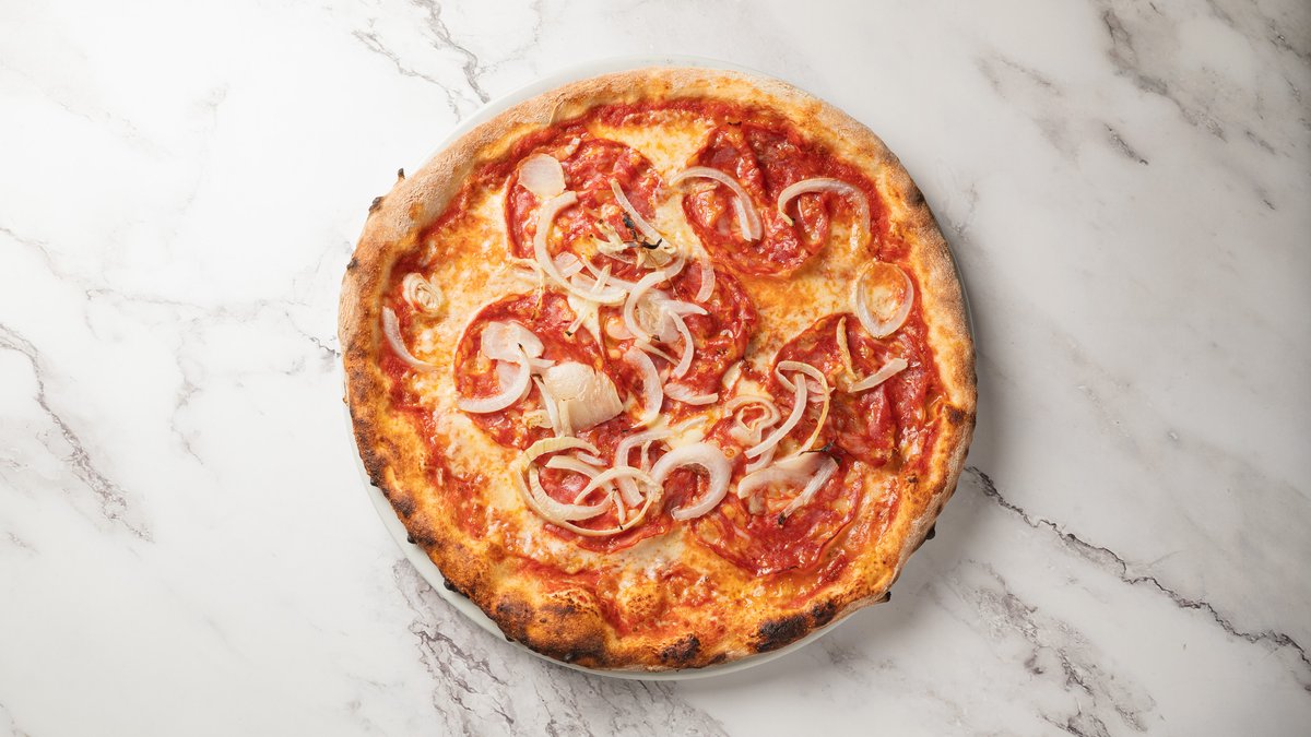 Tomatsovs, mozzarella fior di latte, stærk salame og løg.