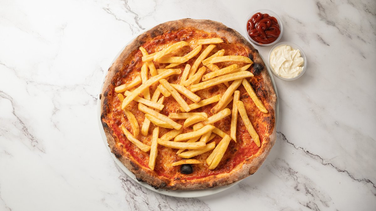 Tomatsovs, mozzarella fior di latte og pommes frites. Serveres m. ketchup eller mayo.